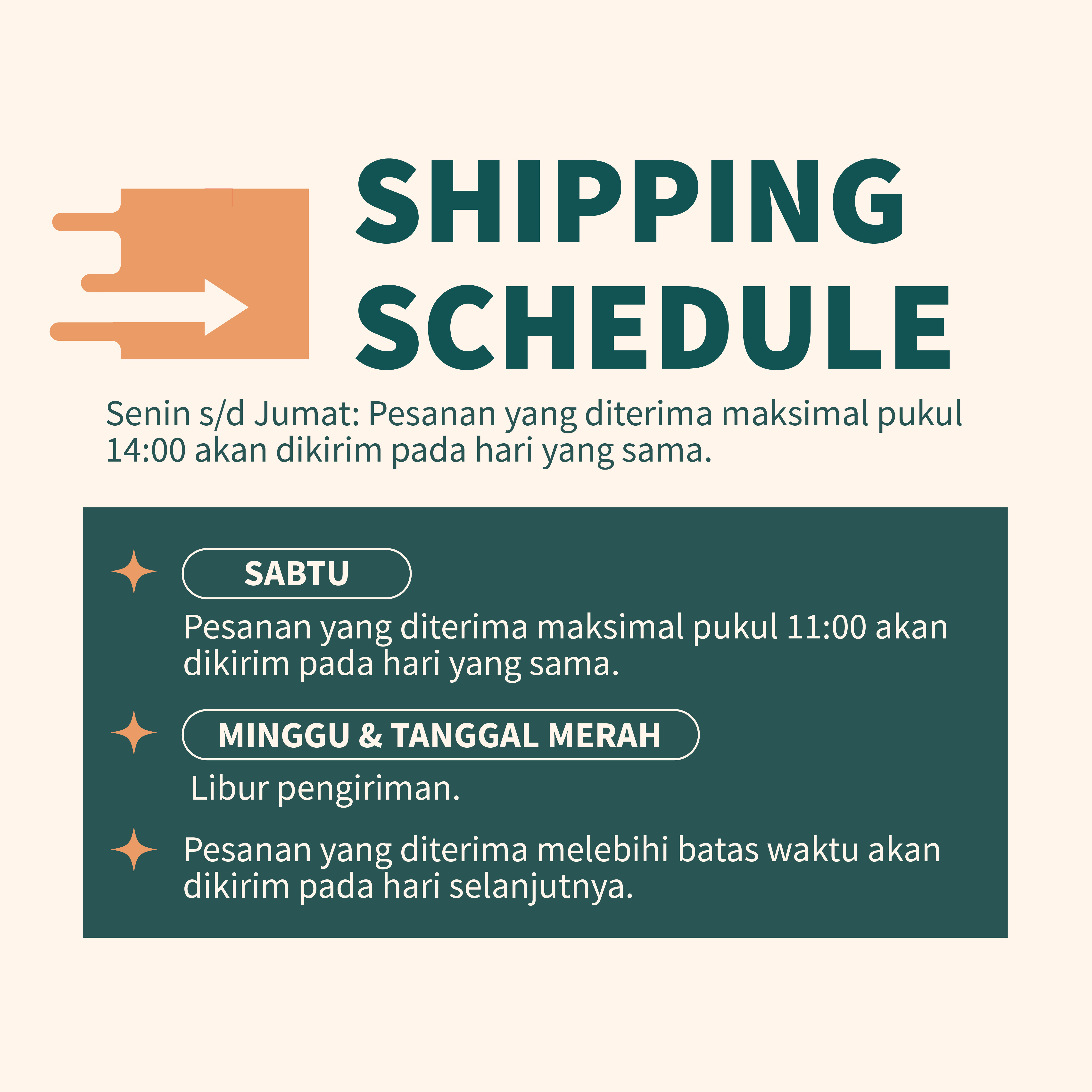 - Senin s/d Jumat: Pesanan yang diterima maksimal pukul 14:00 akan dikirim pada hari yang sama.